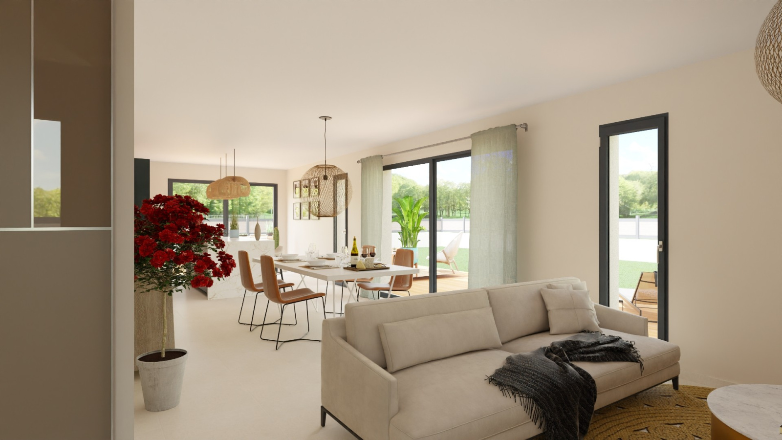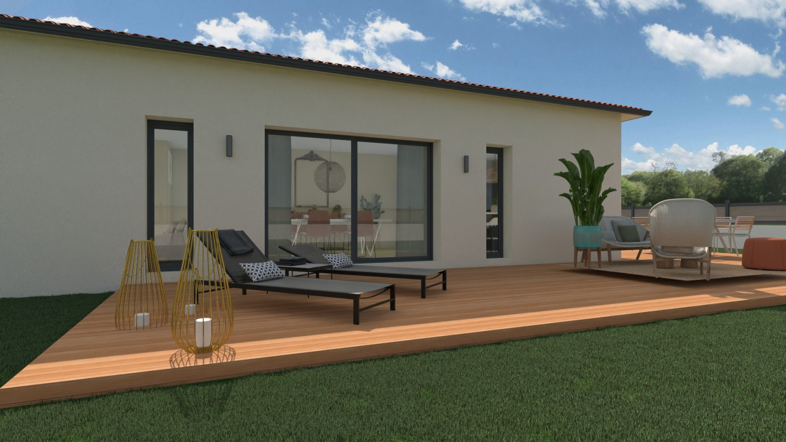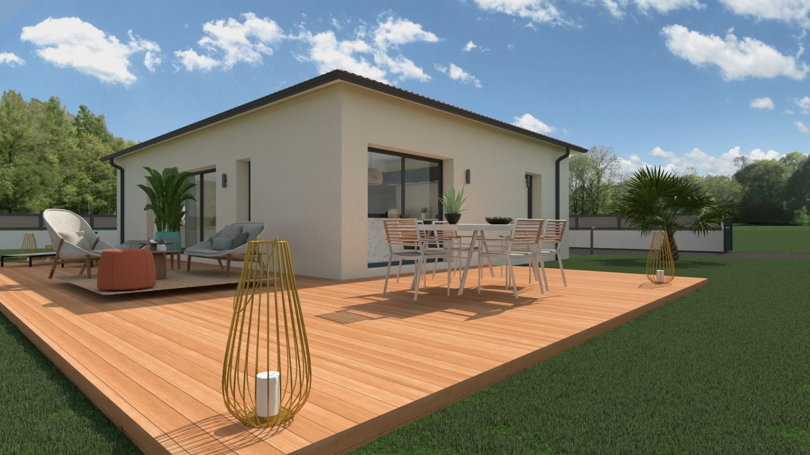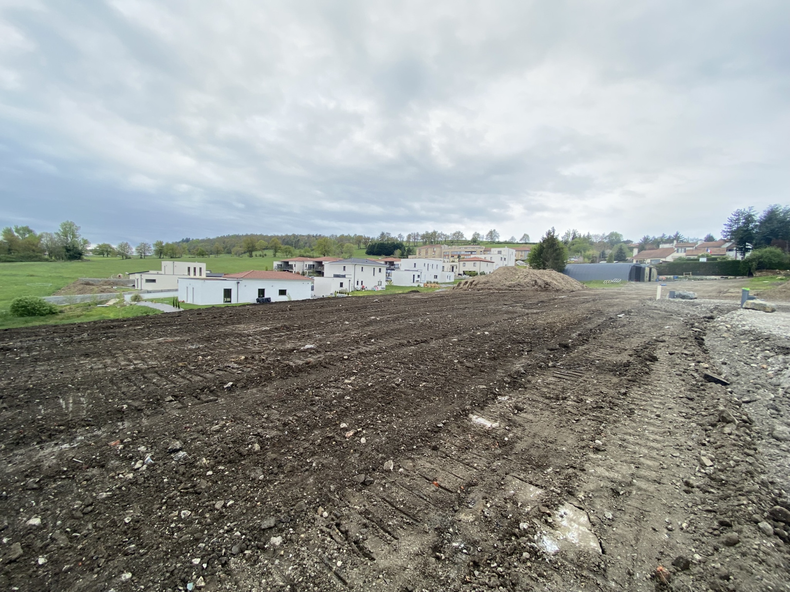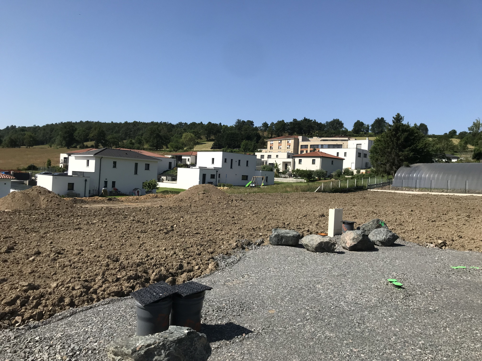 Terrain 763 m² plat et entièrement viabilisé (EDF, Fibre, eau, tout à l'égoût, eaux pluviales), exposition SUD, vue dégagée, terrain paysagé en partie. Travaux de viabilisations terminés. Coefficient d'emprise au sol : 0.15 m². Surface Libre choix constructeur.